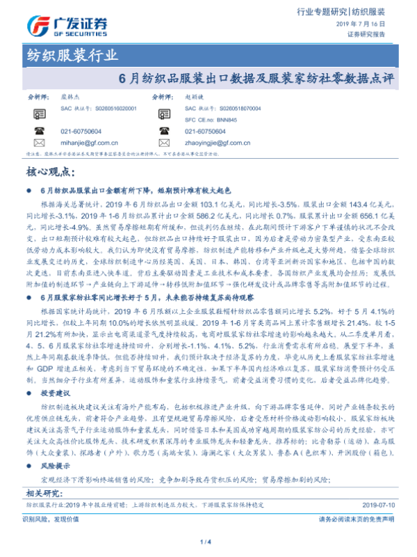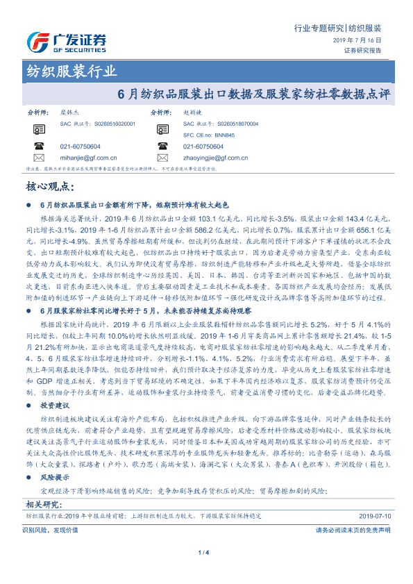 【广发证券】【20190716】20190716-广发证券-纺织服装行业专题研究:6月纺织品服装出口数据及服装家纺社零数据点评-4页