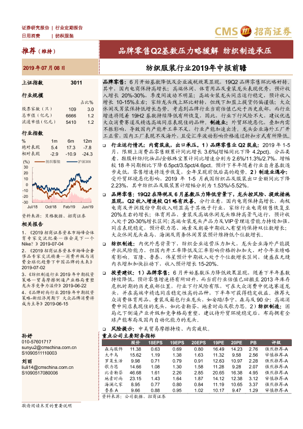 【海通证券】【20190708】纺织服装行业2019年中报前瞻:品牌零售Q2基数压力略缓解 纺织制造承压-16页
