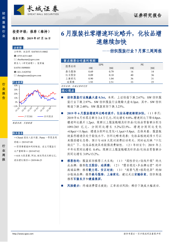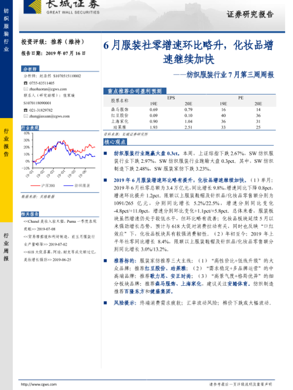 【长城证券】【20190716】20190716-长城证券-纺织服装行业7月第三周周报:6月服装社零增速环比略升,化妆品增速继续加快-21页