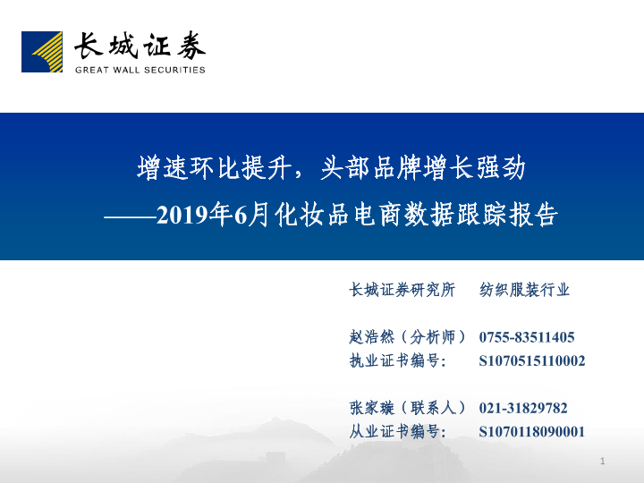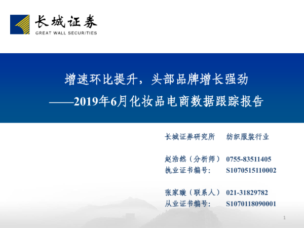 【长城证券】【20190716】2019年6月化妆品电商数据跟踪报告:增速环比提升,头部品牌增长强劲-25页
