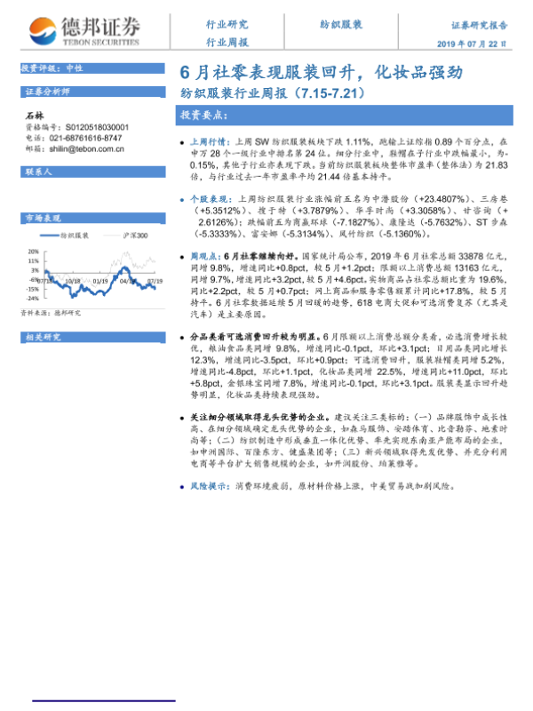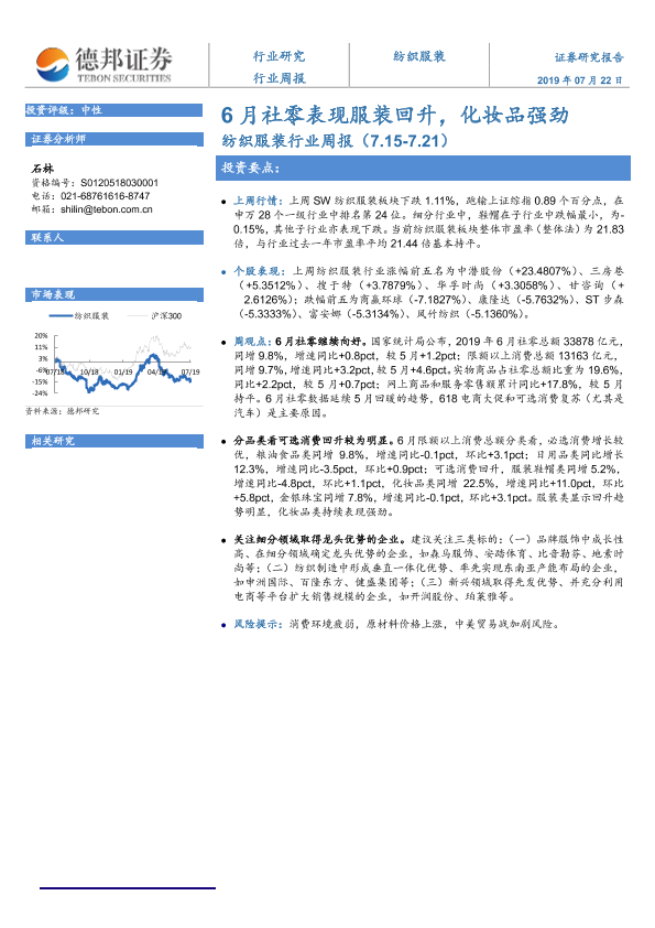 【德邦证券】【20190722】20190722-德邦证券-纺织服装行业周报:6月社零表现服装回升,化妆品强劲-7页