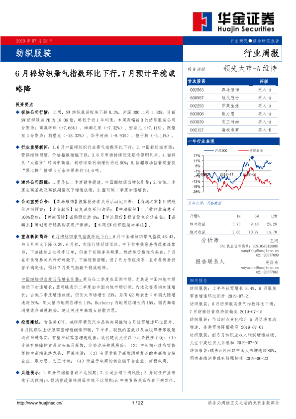 【华金证券】【20190728】纺织服装行业周报:6月棉纺织景气指数环比下行,7月预计平稳或略降-22页