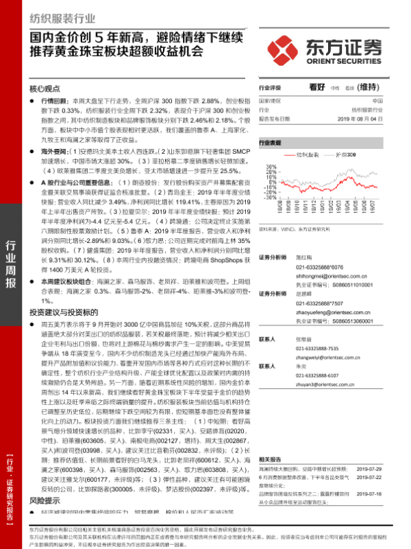 【东方证券】【20190804】20190804-东方证券-纺织服装行业周报:国内金价创5年新高,避险情绪下继续推荐黄金珠宝板块超额收益机会-11页