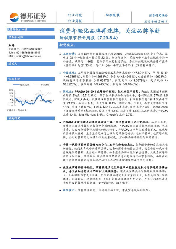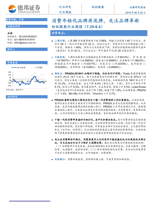 【德邦证券】【20190805】20190805-德邦证券-纺织服装行业周报:消费年轻化品牌再洗牌,关注品牌革新-8页