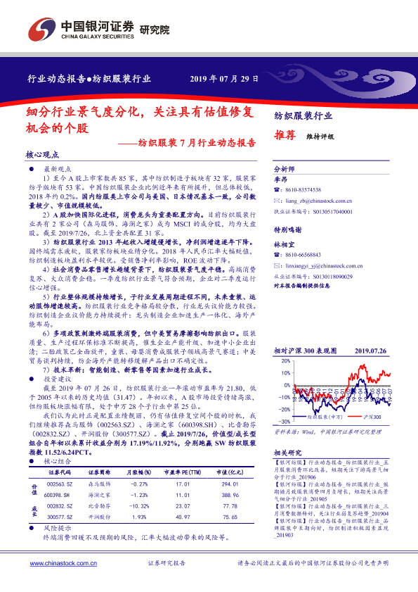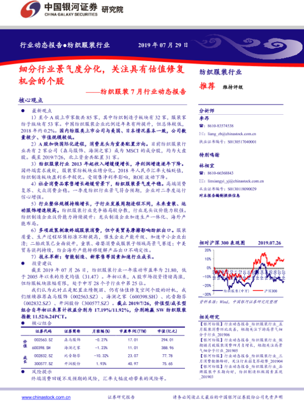【银河证券】【20190729】20190729-中国银河-纺织服装7月行业动态报告:细分行业景气度分化,关注具有估值修复机会的个股-37页
