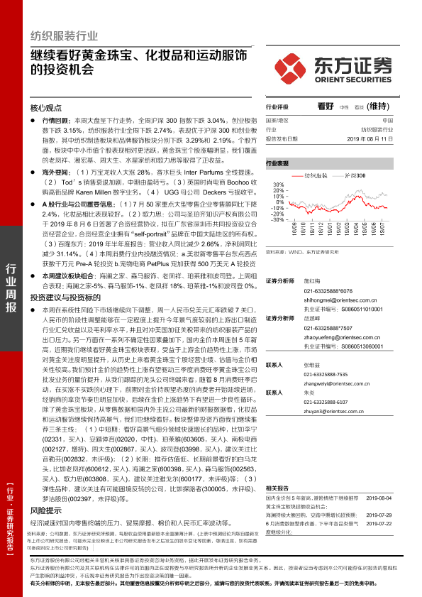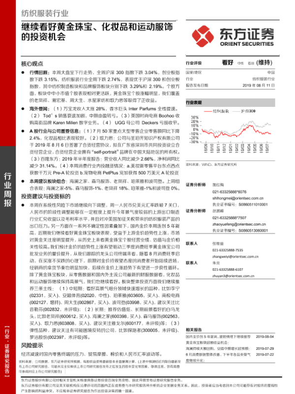 【东方证券】【20190811】纺织服装行业:继续看好黄金珠宝、化妆品和运动服饰的投资机会-11页