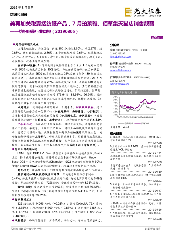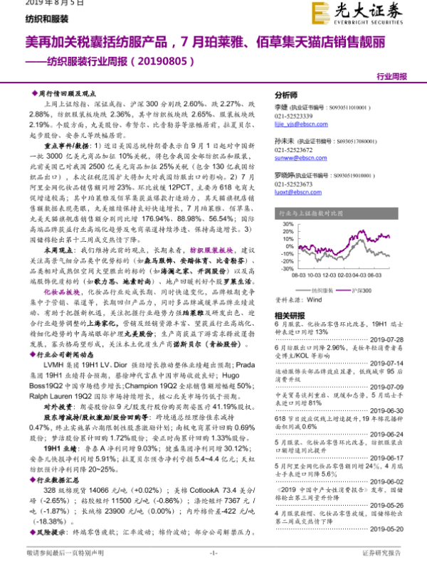 【光大证券】【20190805】光大证券-纺织服装行业周报:美再加关税囊括纺服产品,7月珀莱雅、佰草集天猫店销售靓丽-19页