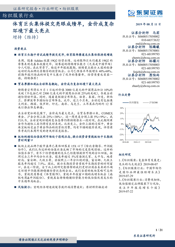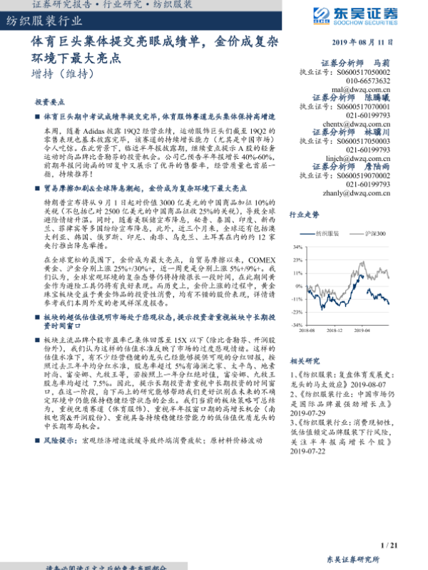【东吴证券】【20190811】20190811-东吴证券-纺织服装行业跟踪周报:体育巨头集体提交亮眼成绩单,金价成复杂环境下最大亮点-21页