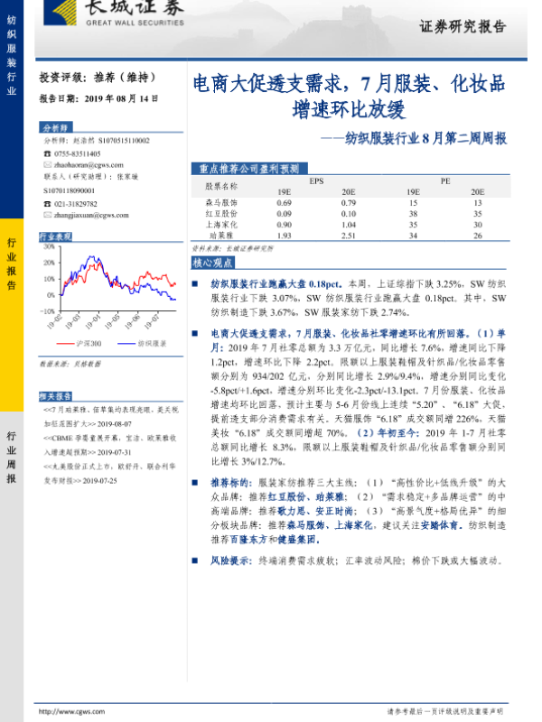 【长城证券】【20190814】20190814-长城证券-纺织服装行业8月第二周周报:电商大促透支需求,7月服装、化妆品增速环比放缓-21页