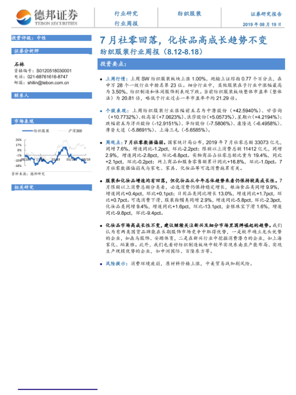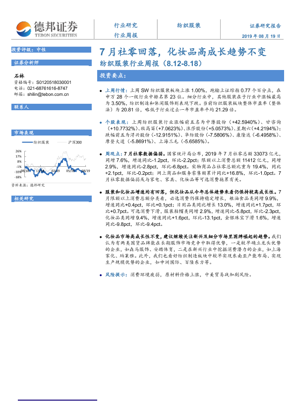 【德邦证券】【20190819】20190819-德邦证券-纺织服装行业周报:7月社零回落,化妆品高成长趋势不变-7页