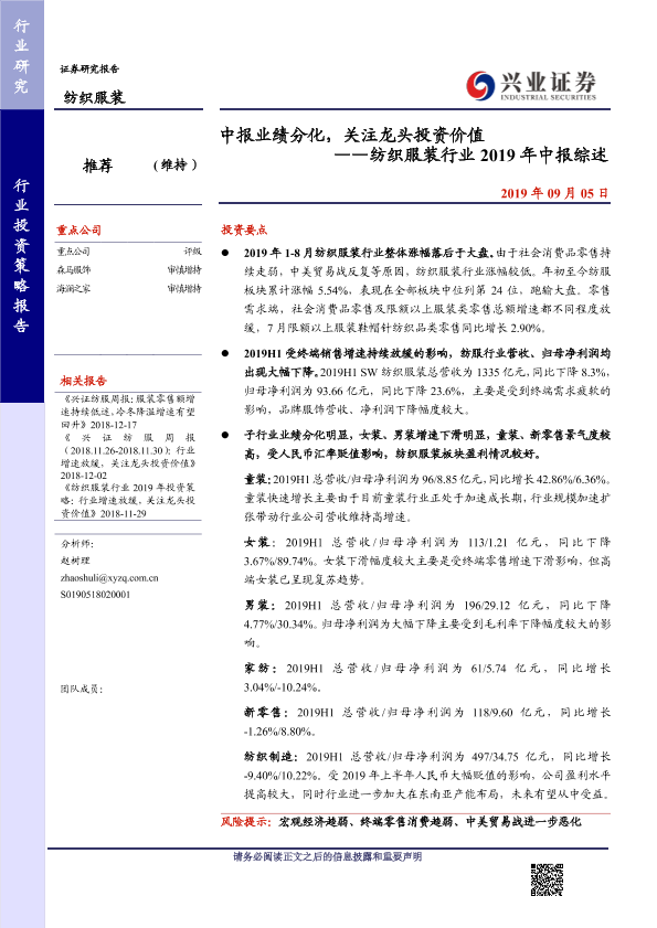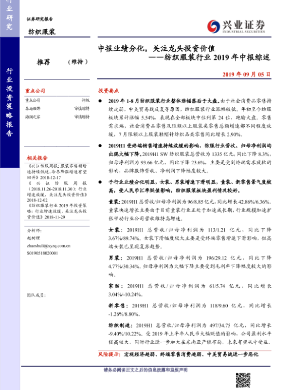 【兴业证券】【20190905】中报业绩分化,关注龙头投资价值 ——纺织服装行业2019年中报综述-23页