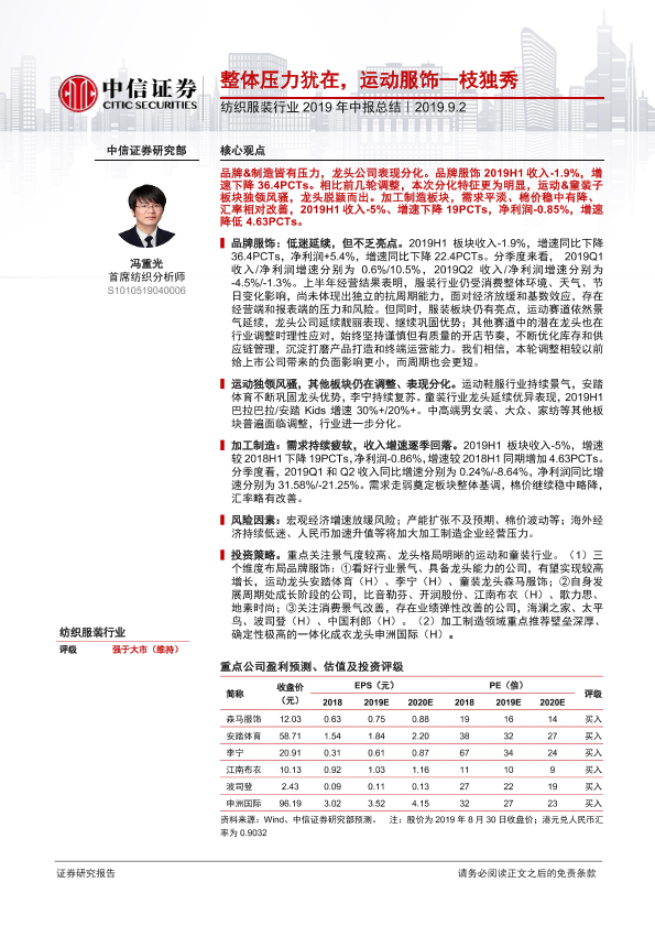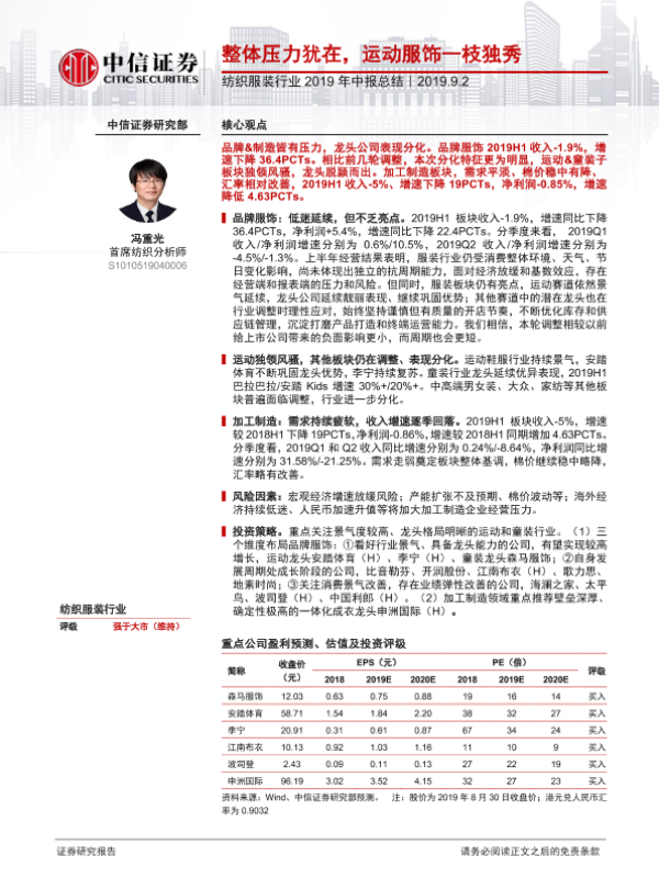【中信证券】【20190902】纺织服装行业2019年中报总结:整体压力犹在,运动服饰一枝独秀-20页