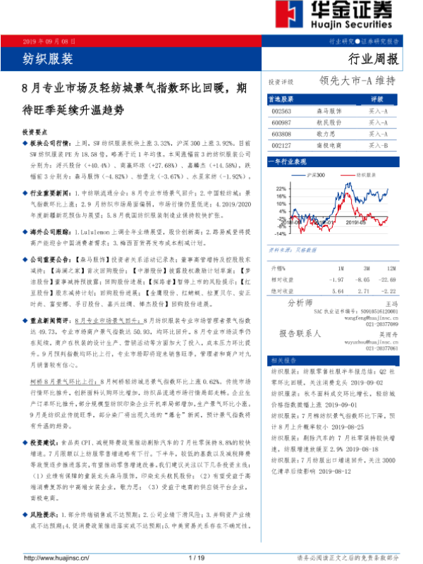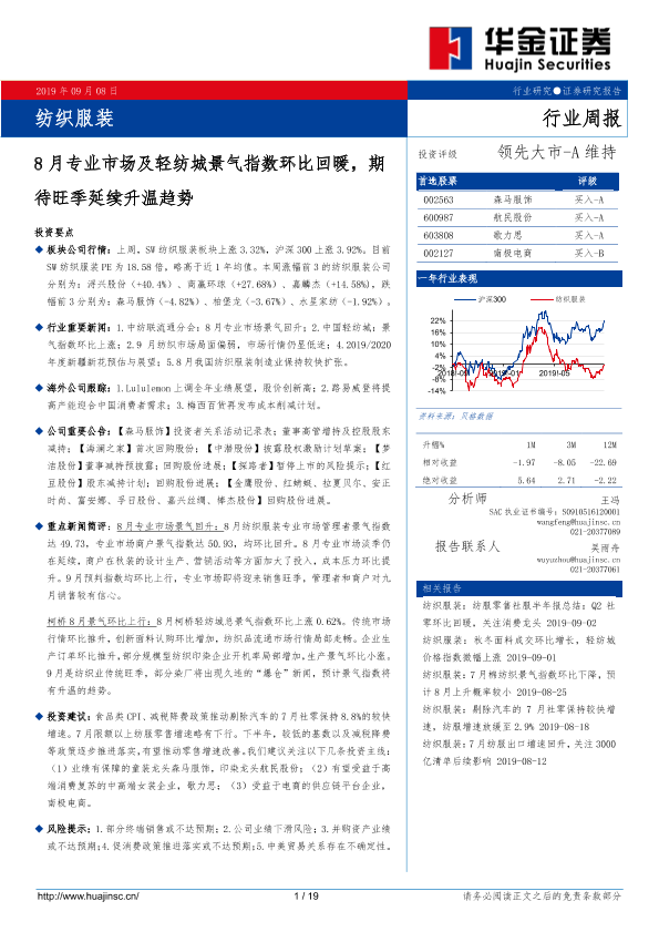【华金证券】【20190908】20190908-华金证券-纺织服装行业周报:8月专业市场及轻纺城景气指数环比回暖,期待旺季延续升温趋势-19页
