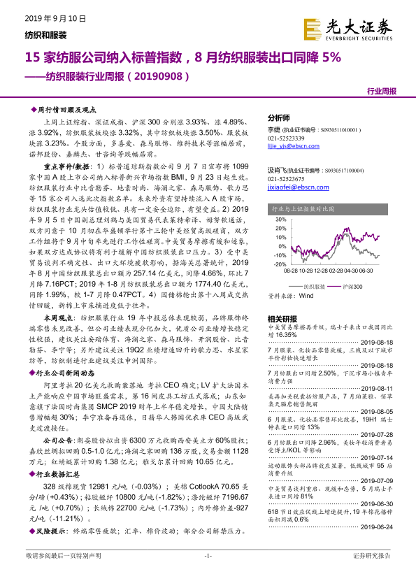 【光大证券】【20190910】纺织服装行业周报:15家纺服公司纳入标普指数,8月纺织服装出口同降5%-16页
