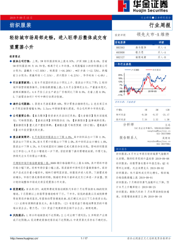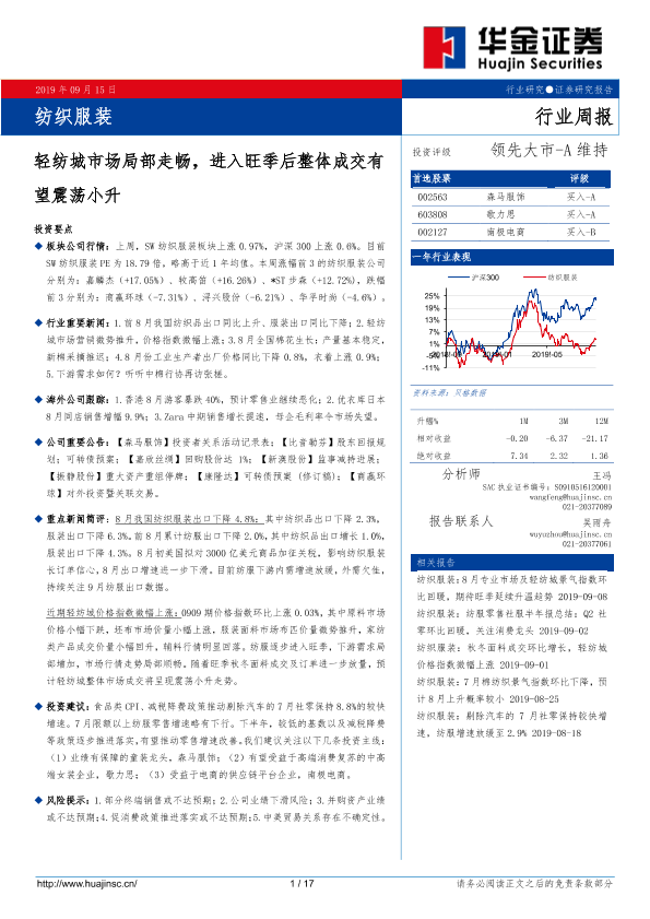 【华金证券】【20190915】纺织服装行业周报:轻纺城市场局部走畅,进入旺季后整体成交有望震荡小升-17页