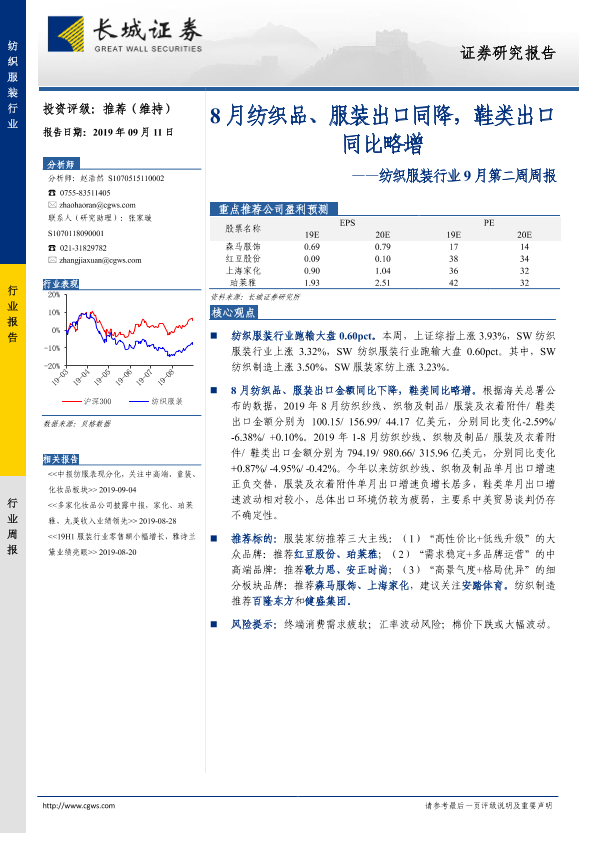 【长城证券】【20190911】20190911-长城证券-纺织服装行业9月第二周周报:8月纺织品、服装出口同降,鞋类出口同比略增-21页