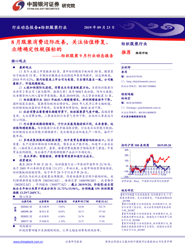 【银河证券】【20190923】20190923-中国银河-纺织服装9月行业动态报告:8月服装消费边际改善,关注估值修复、业绩确定性较强标的-37页