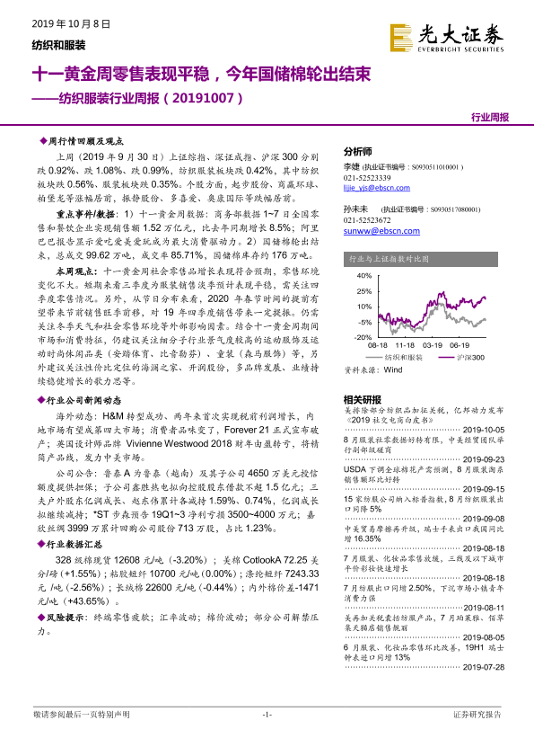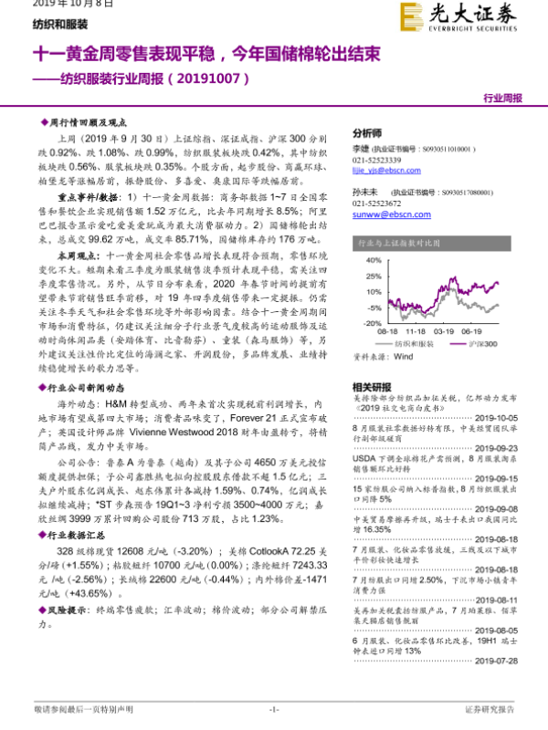 【光大证券】【20191008】20191008-光大证券-纺织服装行业周报:十一黄金周零售表现平稳,今年国储棉轮出结束-19页