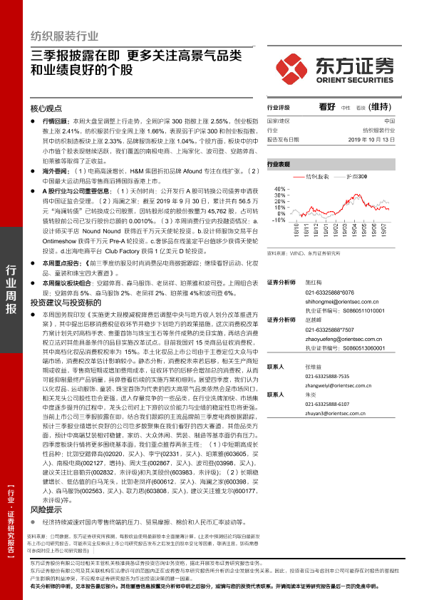 【东方证券】【20191013】纺织服装行业:三季报披露在即 更多关注高景气品类和业绩良好的个股-12页