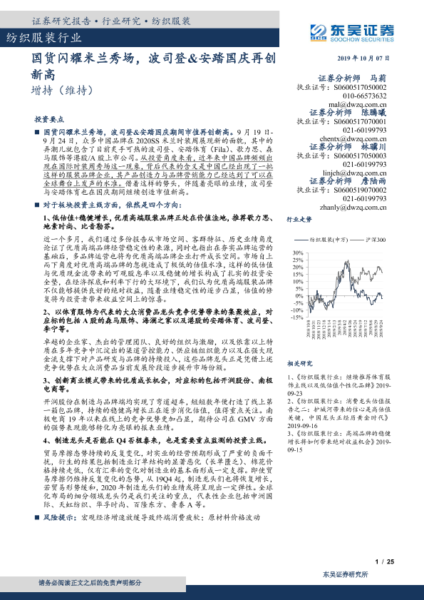 【东吴证券】【20191007】20191007-东吴证券-纺织服装行业跟踪周报:国货闪耀米兰秀场,波司登&安踏国庆再创新高-25页