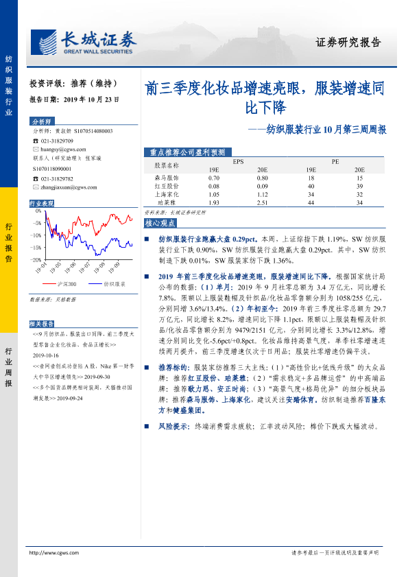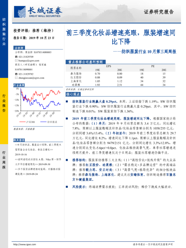 【长城证券】【20191023】20191023-长城证券-纺织服装行业10月第三周周报:前三季度化妆品增速亮眼,服装增速同比下降-21页