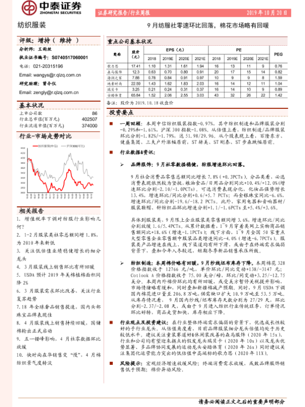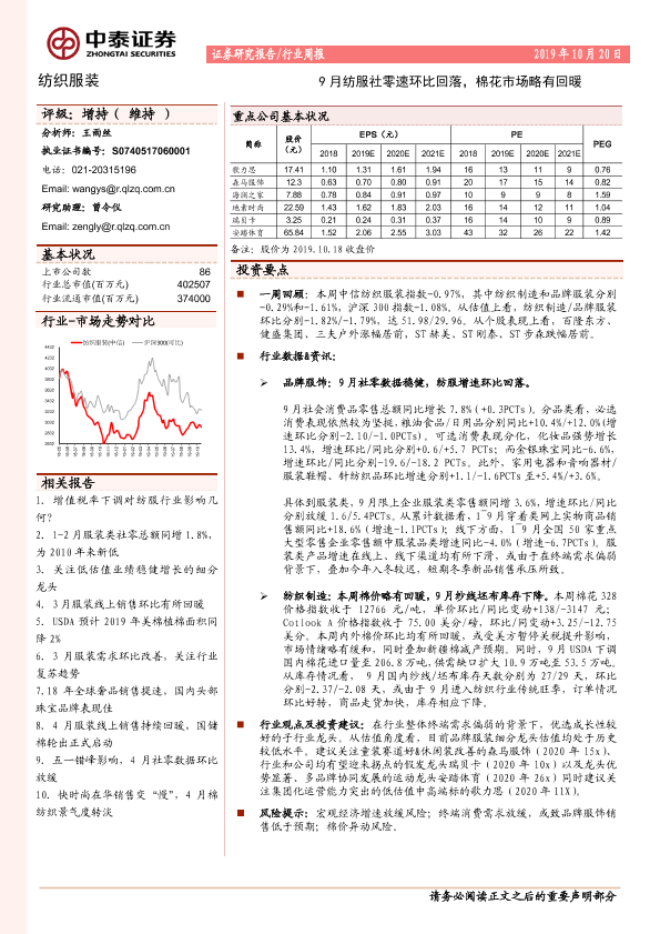 【中泰证券】【20191020】20191020-中泰证券-纺织服装行业周报:9月纺服社零速环比回落,棉花市场略有回暖-13页