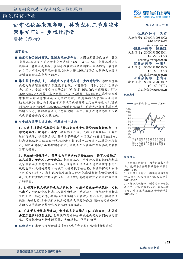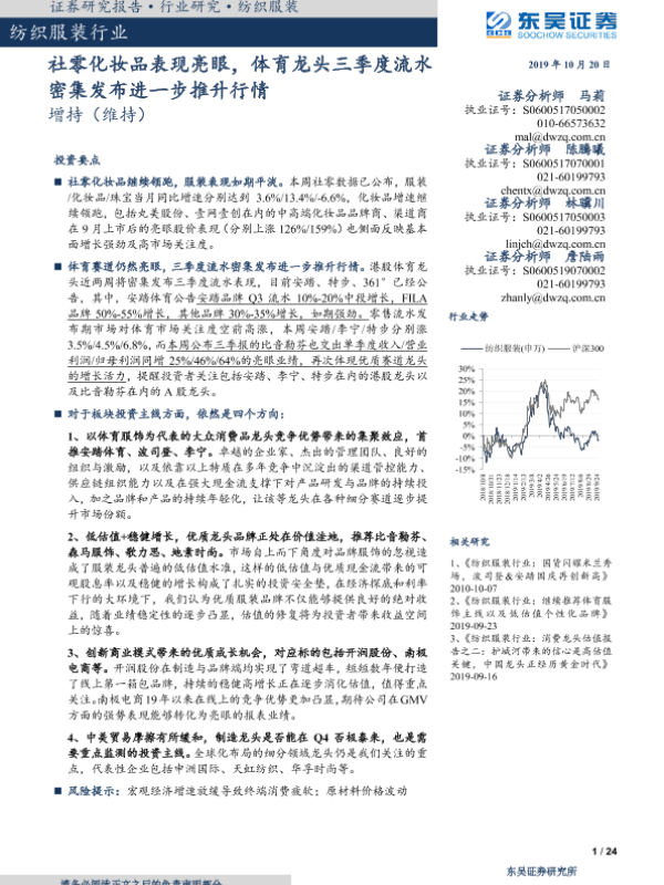 【东吴证券】【20191020】纺织服装行业:社零化妆品表现亮眼,体育龙头三季度流水密集发布进一步推升行情-24页