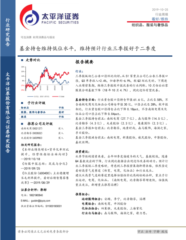 【太平洋证券】【20191025】20191025-太平洋-纺织品、服装与奢侈品行业周报:基金持仓维持低位水平,维持预计行业三季报好于二季度-20页