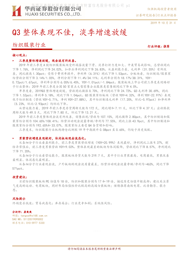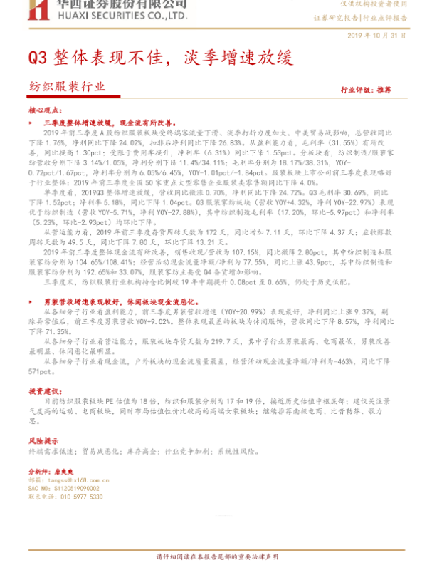 业绩分析 毛利率 淡季影响 现金流 纺织服装