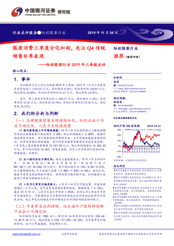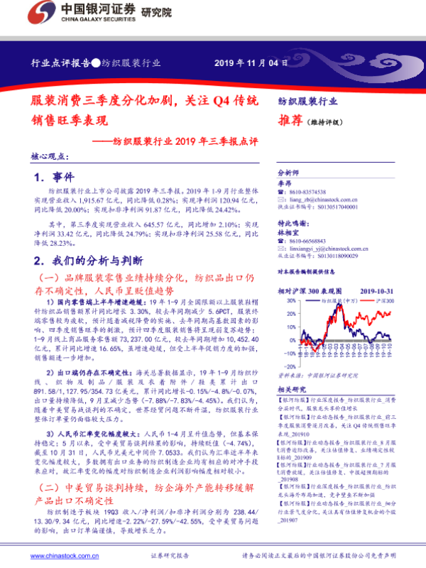 【银河证券】【20191104】纺织服装行业2019年三季报点评:服装消费三季度分化加剧,关注Q4传统销售旺季表现-6页