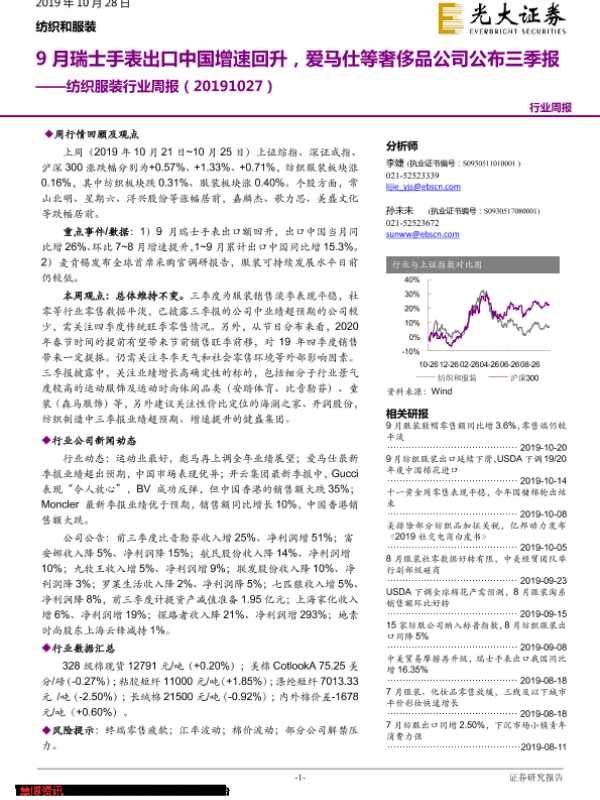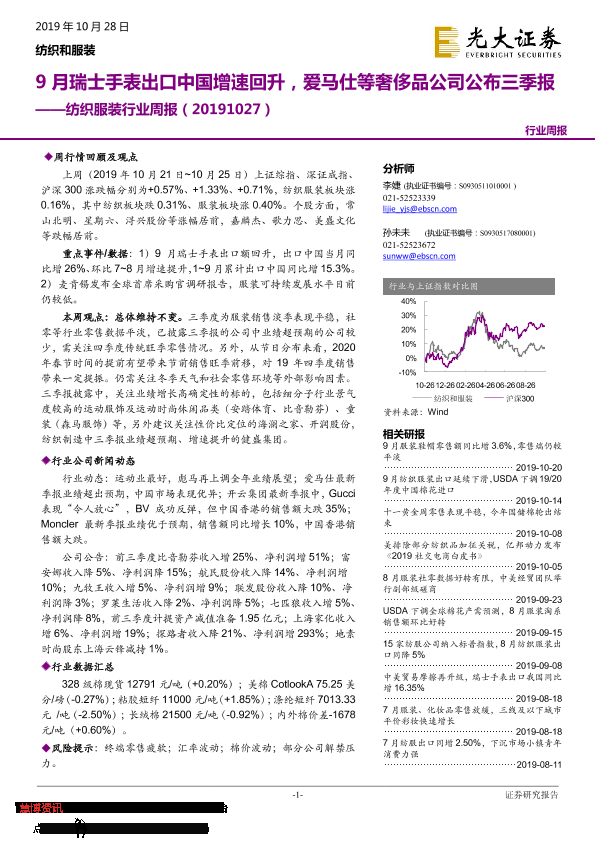 【光大证券】【20191028】20191028-光大证券-纺织服装行业周报:9月瑞士手表出口中国增速回升,爱马仕等奢侈品公司公布三季报-21页