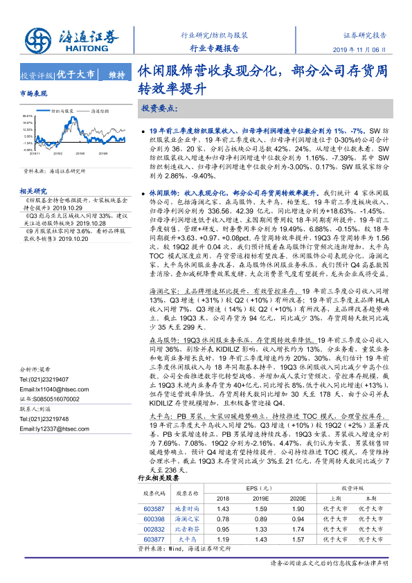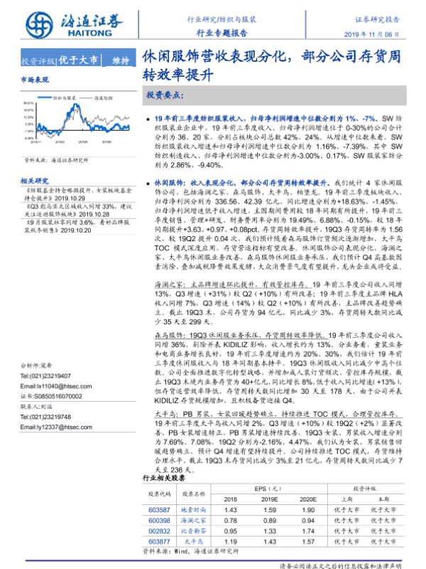 【海通证券】【20191106】纺织与服装行业专题报告:休闲服饰营收表现分化,部分公司存货周转效率提升-27页