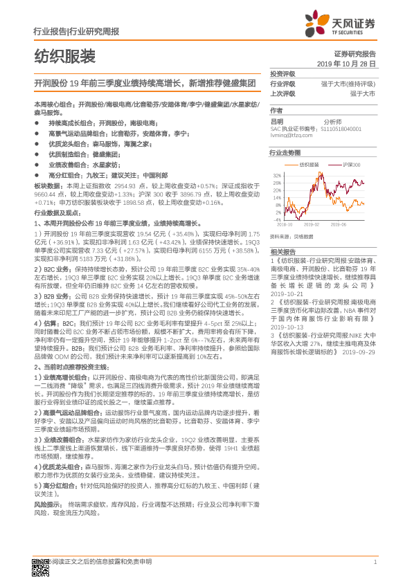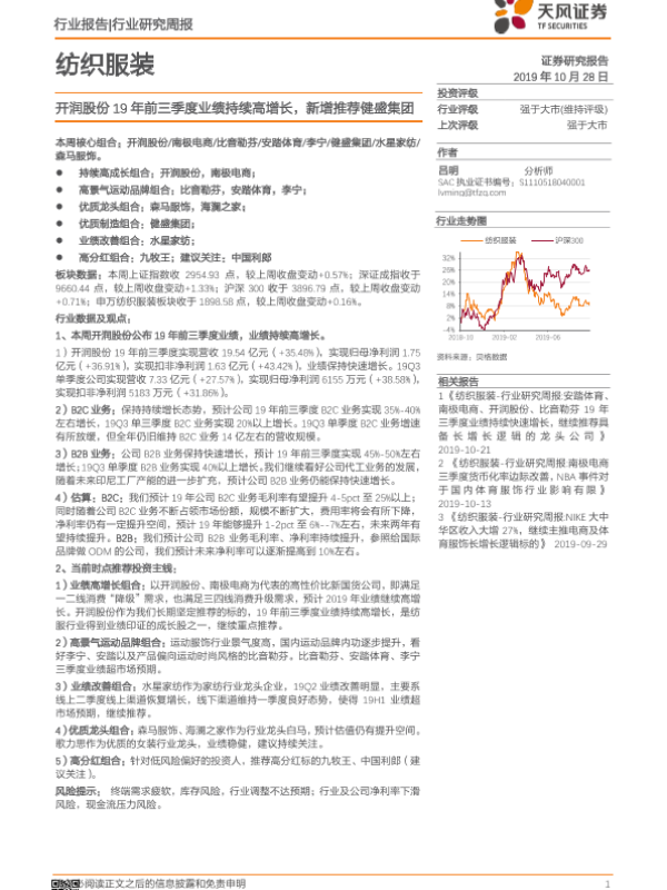 【天风证券】【20191028】20191028-天风证券-纺织服装行业研究周报:开润股份19年前三季度业绩持续高增长,新增推荐健盛集团-18页
