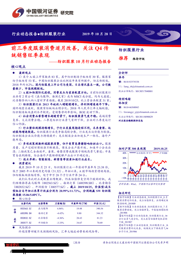 【银河证券】【20191028】20191028-中国银河-纺织服装10月行业动态报告:前三季度服装消费逐月改善,关注Q4传统销售旺季表现-37页
