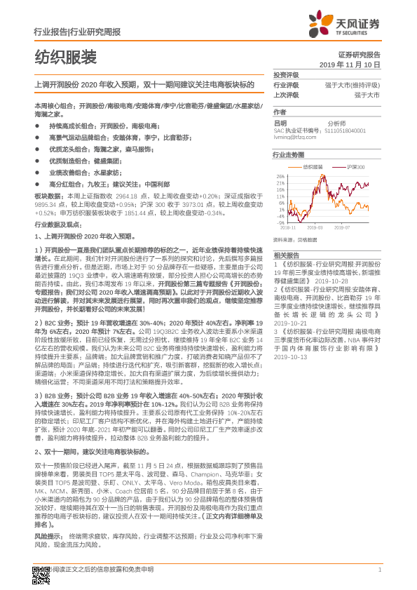 【天风证券】【20191110】20191110-天风证券-纺织服装行业研究周报:上调开润股份2020年收入预期,双十一期间建议关注电商板块标的-18页