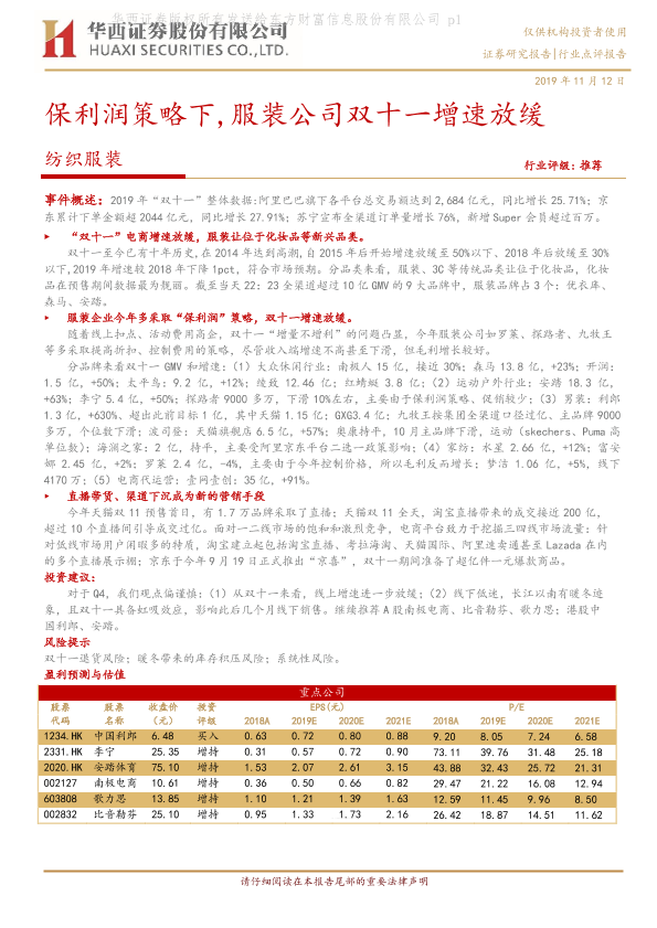 【华西证券】【20191112】保利润策略下,服装公司双十一增速放缓-5页