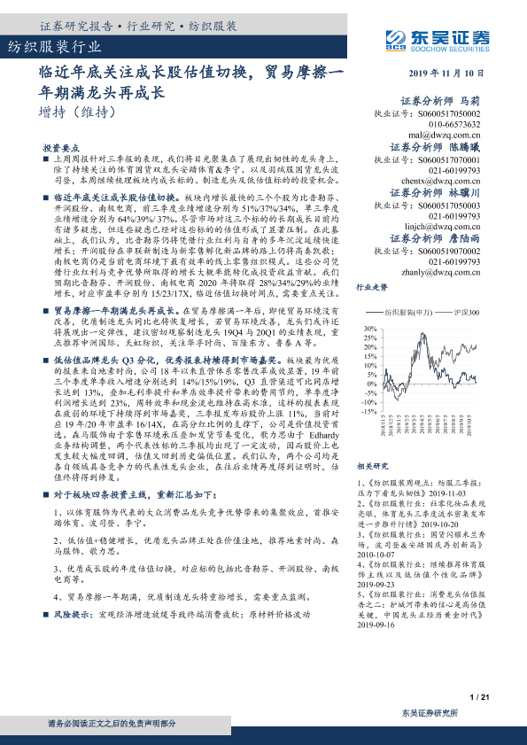【东吴证券】【20191110】20191110-东吴证券-纺织服装行业:临近年底关注成长股估值切换,贸易摩擦一年期满龙头再成长-21页