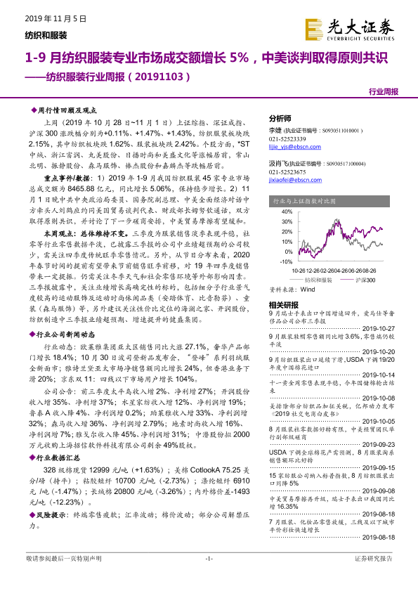【光大证券】【20191105】20191105-光大证券-纺织服装行业周报:1-9月纺织服装专业市场成交额增长5%,中美谈判取得原则共识-21页