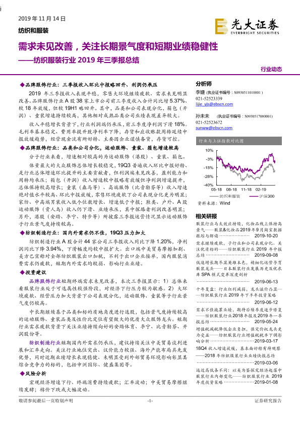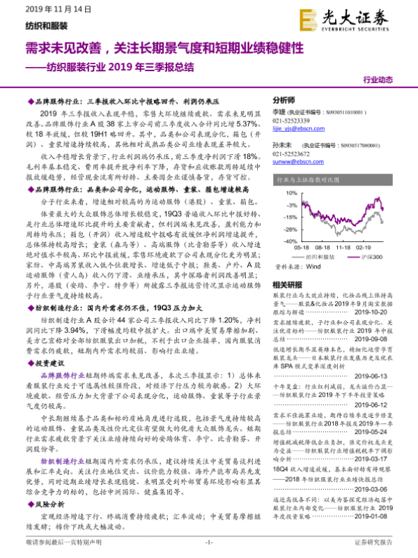 【光大证券】【20191114】纺织服装行业2019年三季报总结:需求未见改善,关注长期景气度和短期业绩稳健性-22页