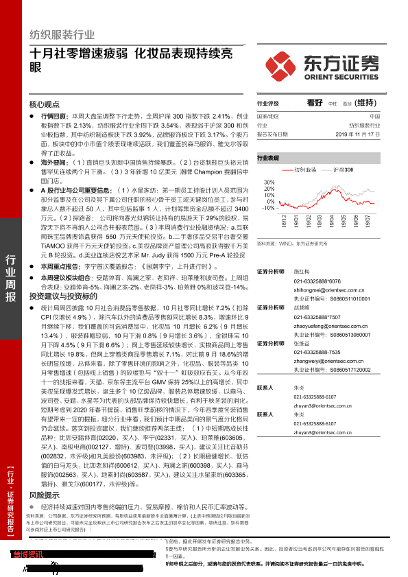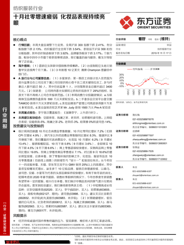 【东方证券】【20191117】20191117-东方证券-纺织服装行业周报:十月社零增速疲弱 化妆品表现持续亮眼-12页