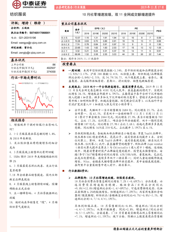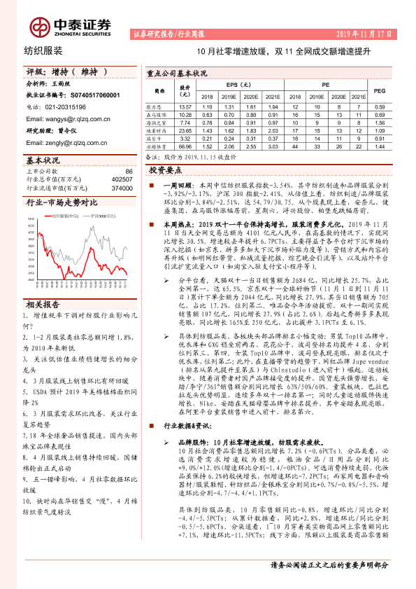 【中泰证券】【20191117】20191117-中泰证券-纺织服装行业周报:10月社零增速放缓,双11全网成交额增速提升-17页