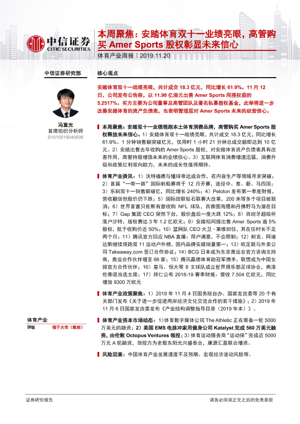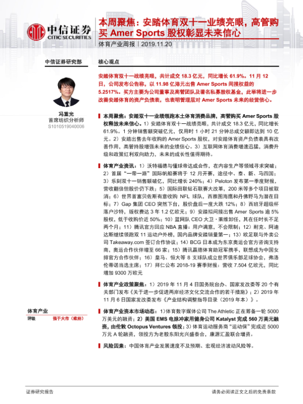 【中信证券】【20191120】20191120-中信证券-体育产业周报:本周聚焦:安踏体育双十一业绩亮眼,高管购买Amer Sports股权彰显未来信心-18页
