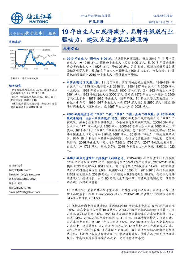 【海通证券】【20191124】20191124-海通证券-纺织与服装行业周报:19年出生人口或将减少,品牌升级成行业驱动力,建议关注童装品牌服饰-8页