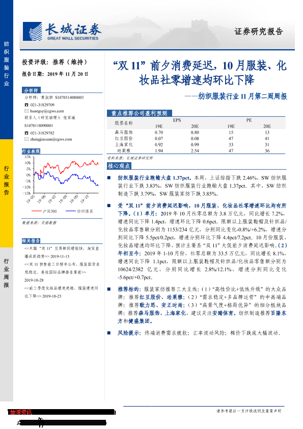 【长城证券】【20191120】纺织服装行业11月第二周周报:“双11”前夕消费延迟,10月服装、化妆品社零增速均环比下降-22页
