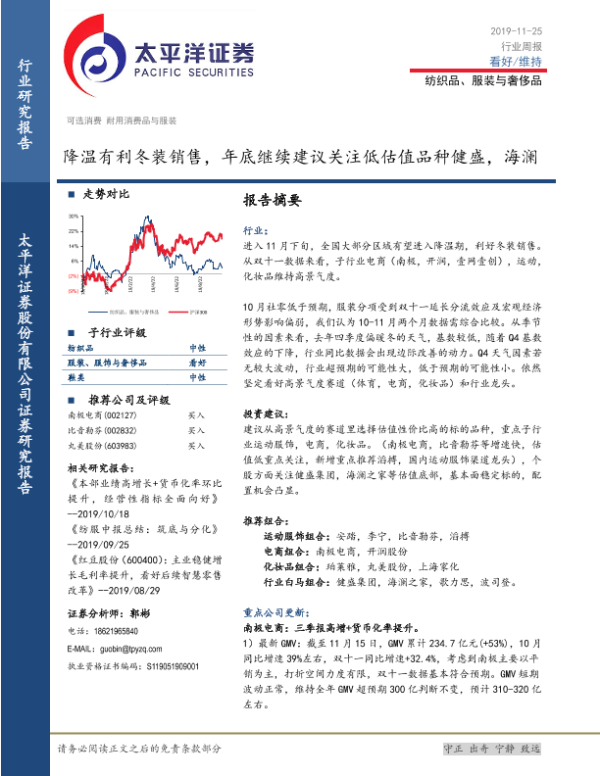【太平洋证券】【20191125】20191125-太平洋-纺织品、服装与奢侈品行业周报:降温有利冬装销售,年底继续建议关注低估值品种健盛,海澜-23页