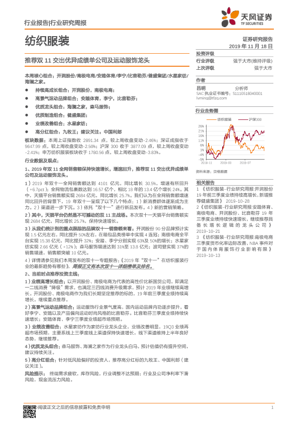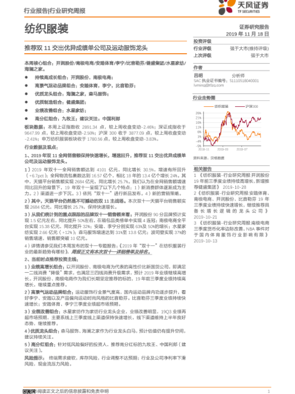 【天风证券】【20191118】纺织服装行业研究周报:推荐双11交出优异成绩单公司及运动服饰龙头-20页