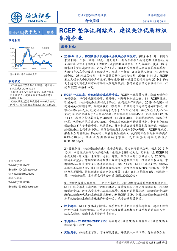 【海通证券】【20191209】20191209-海通证券-纺织与服装行业周报:RCEP整体谈判结束,建议关注优质纺织制造企业-7页