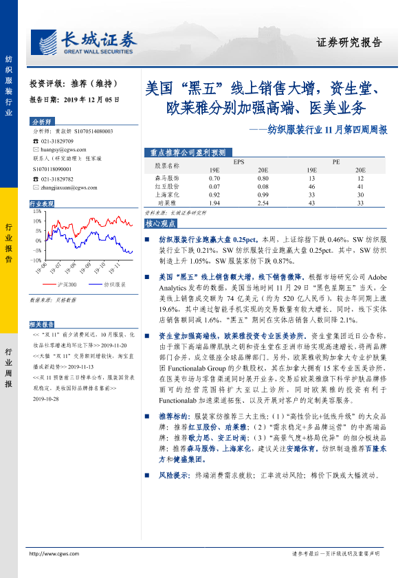 【长城证券】【20191205】20191205-长城证券-纺织服装行业11月第四周周报:美国“黑五”线上销售大增,资生堂、欧莱雅分别加强高端、医美业务-22页