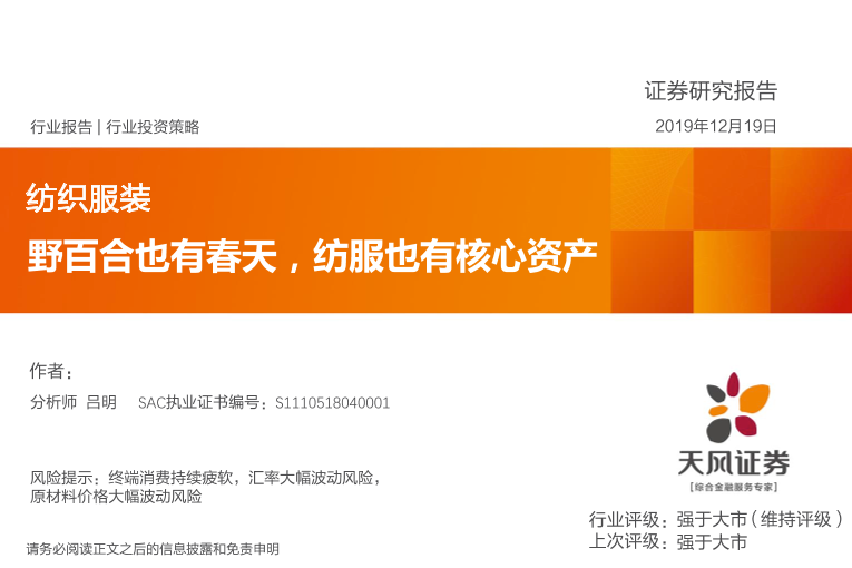 【天风证券】【20191219】20191219-天风证券-纺织服装行业投资策略:野百合也有春天,纺服也有核心资产-64页