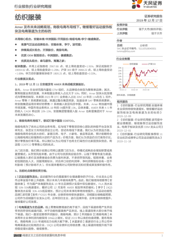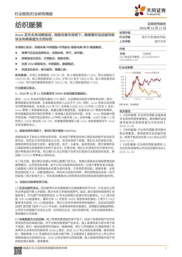 【天风证券】【20191217】20191217-天风证券-纺织服装行业研究周报:Amer发布未来战略规划,南极电商布局线下,继续看好运动服饰板块及电商渠道为主的标的-16页